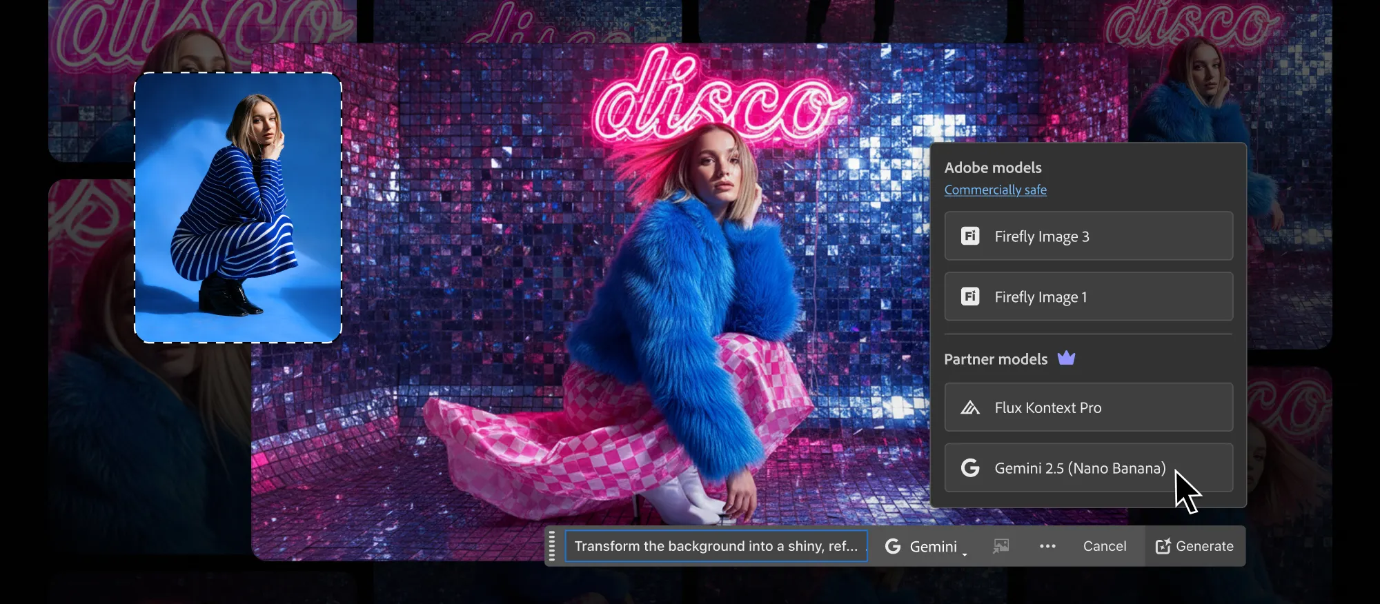 The update introduces Google’s Gemini 2.5 Flash Image Model (Nano Banana) and Black Forest Labs’ FLUX.1 Kontext [pro], which now appear alongside Adobe’s Firefly image models within Photoshop’s Generative Fill tool. The addition gives users access to multiple AI generation options directly inside Photoshop, enabling them to add, remove, or modify image content using natural-language prompts and then refine results with Photoshop’s traditional editing tools.
