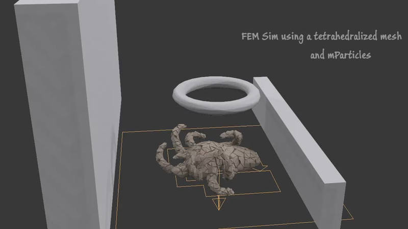 A video by MOAB shows a method for faking a FEM solver in Max using MParticles (Box #2 with MP Glue). The artist is also working on a tool to tetrahedralize meshes, for use with this method. Watch the video on Vimeo.