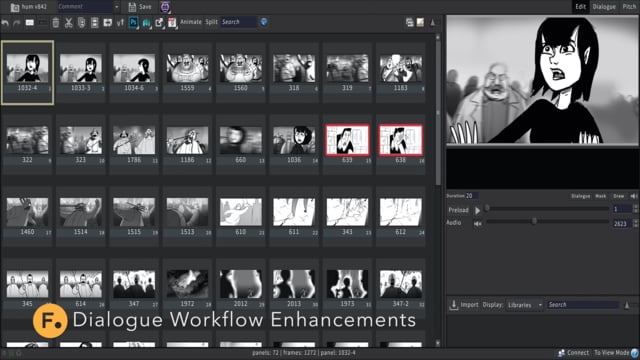 The dialogue workspace has seen improvement with the larger and less cluttered thumbnails. Dialogue can now be burnt in when using the Export Movie plug-in by adding the dialogue below each panel when exporting a QuickTime.