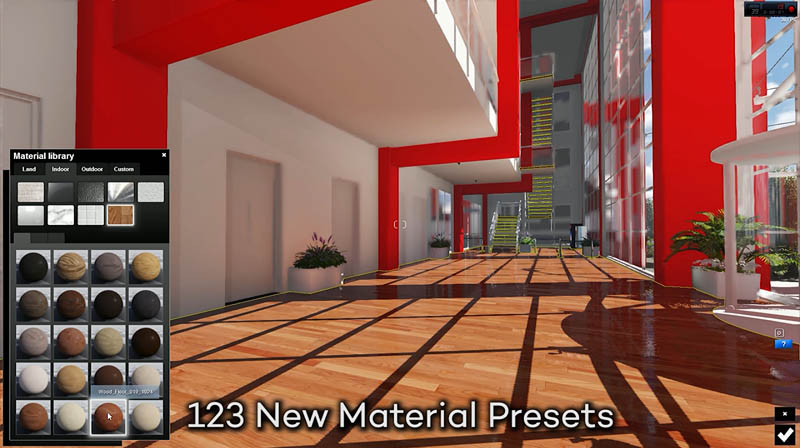 Act-3D announced the upcoming release of v5 of its real-time architectural visualization software. New features include: physically-based materials, new materials interface, Mass Placement feature to build scenes faster, Mass Move effect to animate large numbers of objects, faster rendering, content library updated with new characters and plants, etc.