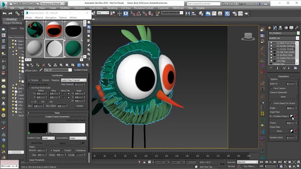 (Updated) A new video is up showing the Strand Rotate modifier, which allows for parametric control of the twist of the strands around their axis.