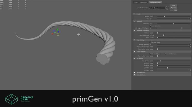Creative Case has released a new commercial plugin for Maya designed for generating primitives along a curve (or two points). It allows to easily create ropes, branches, shoelaces, belts, low poly hair, etc. Watch a video and find out more on Gumroad.