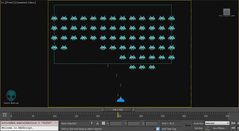 Alvaro Moreira from Particle Skull is working on recreating the classic Space Invaders video game inside 3DS Max. Watch the video and download the scene file from Particle Skull’s Facebook page.