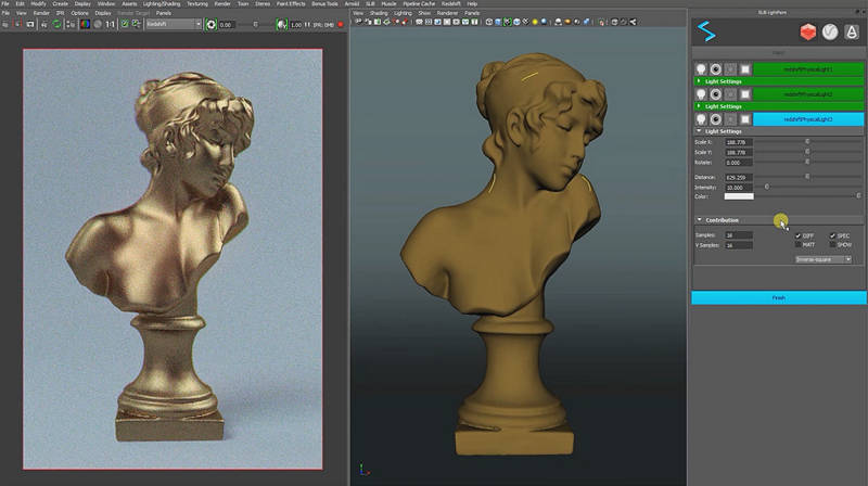 SLiB | Leuchtkraft is a Maya plugin by DGDM that provides a fast and accurate way to set up and control lights. With a simple mouse click you can place them exactly where you want. All important light attributes (Intensity, Distance, Size, Rotation, Contribution, …) can easily be controlled from a single window. Leuchtkraft uses real lights instead of painting the lights on a high dynamic range image.