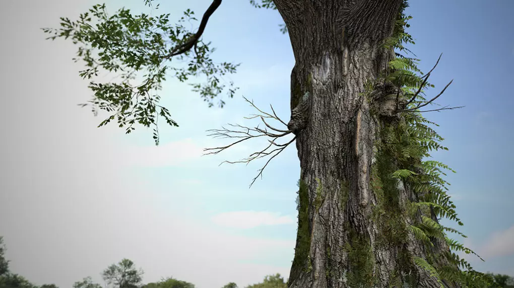 SpeedTree 9.5 also introduces a feature called Projector, which uses ray casting technology to place procedural details like moss, snow, and twigs on model surfaces. This feature aims to distribute these details efficiently and realistically across large-scale environments, simulating how these elements would naturally accumulate on surfaces.
